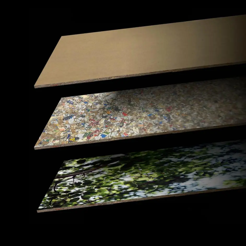 Les panneaux RECOMA sont fabriqués à partir de 100 % d’emballages composites recyclés (briques alimentaires, gobelets, déchets multicouches).